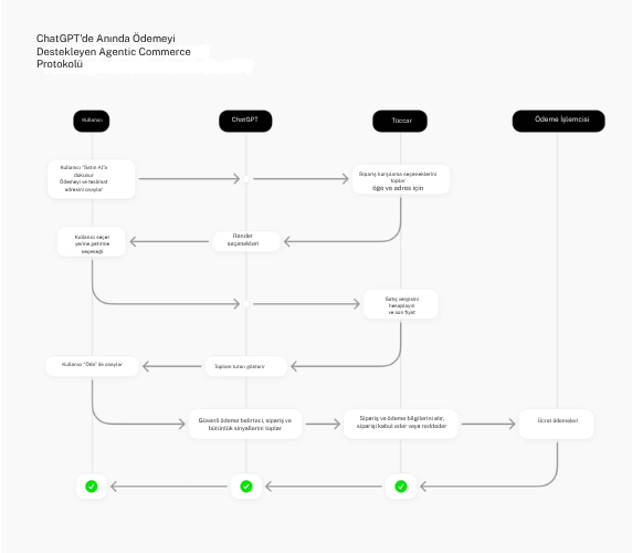 Bu sistemin arka planında, ChatGPT ile satıcıların mevcut altyapıları arasında güvenli bir bağlantı kuran Ajan Ticaret Protokolü (Agentic Commerce Protocol) yer alıyor. Süreç, temel olarak şu adımlarla ilerliyor:
